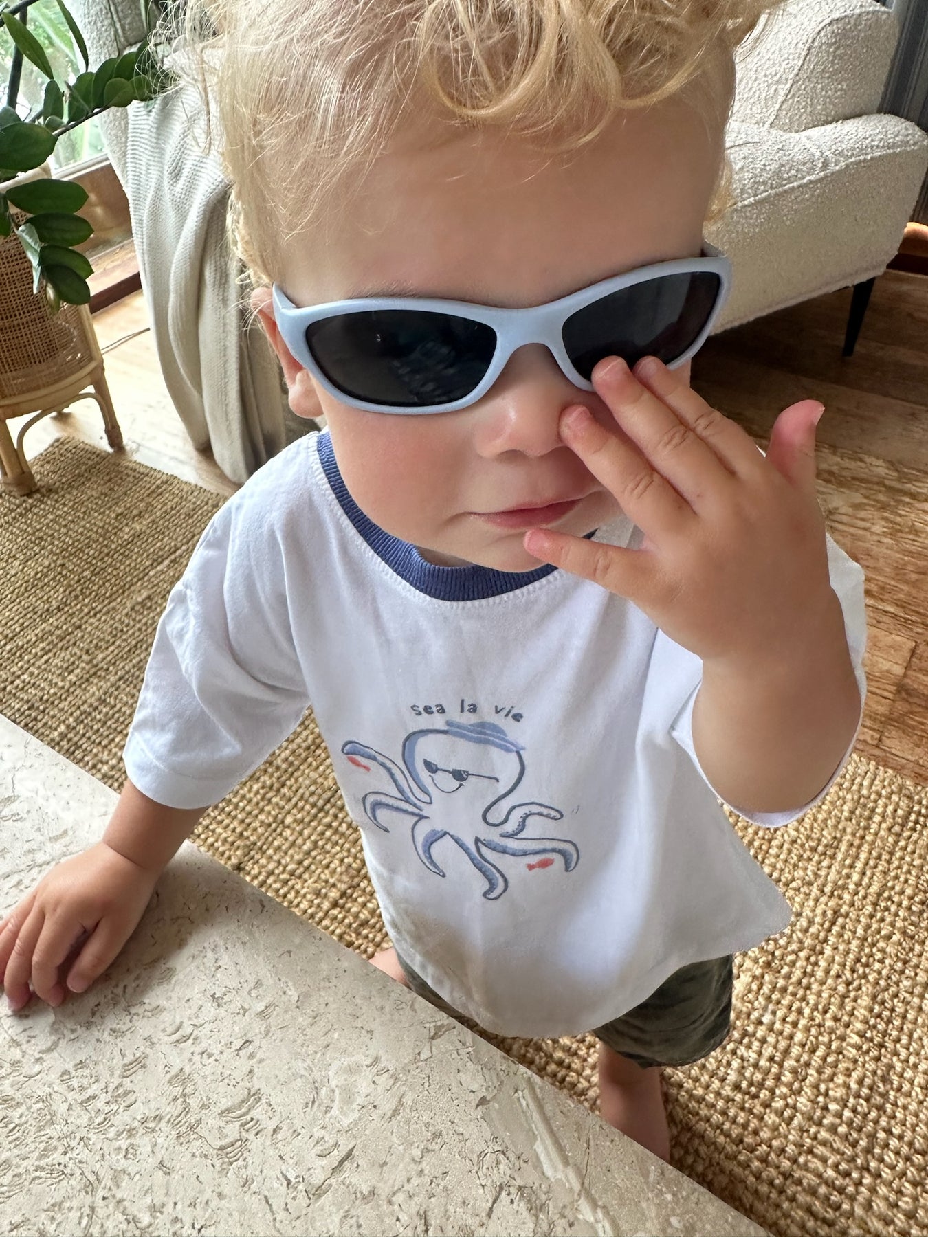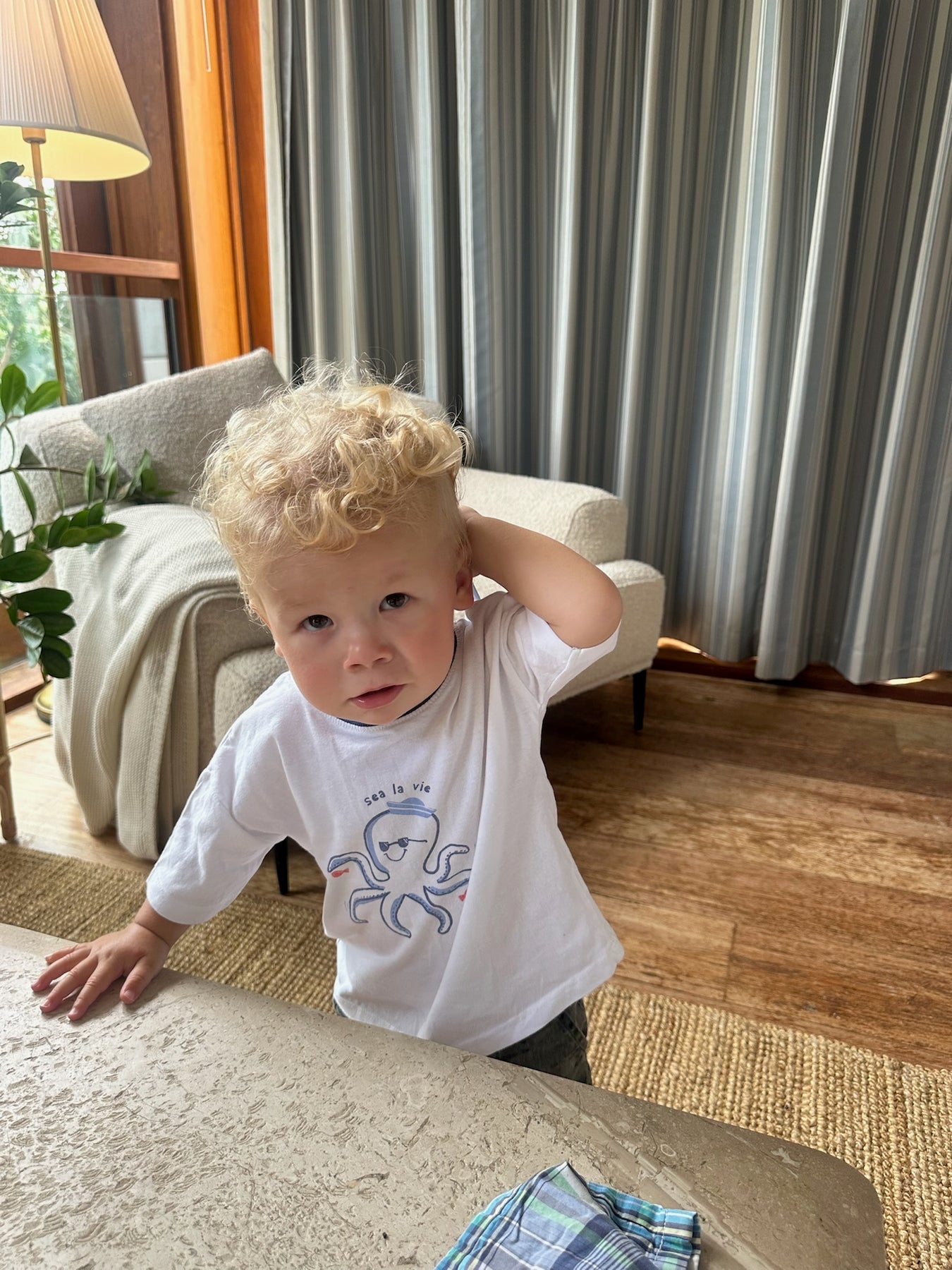 Vintage octopus tee. Soft cotton with the cutest sea-inspired print. Lightly worn for that perfect vintage feel — ready for all your little one’s adventures! White with navy graphics and detailing.